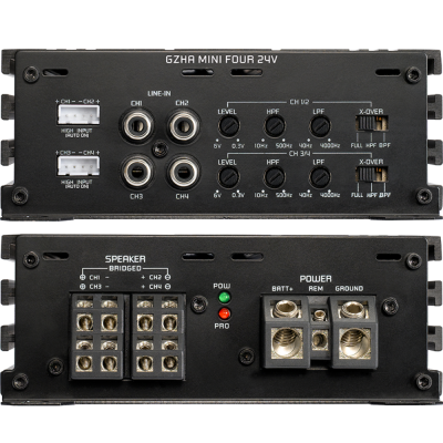 4-channel amplifier with high efficient class D circuit, integrated activ crossover and compact dimensions