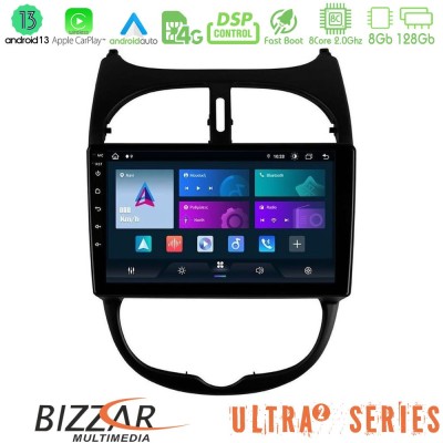 Bizzar Ultra Series Peugeot 206 8core Android13 8+128GB Navigation Multimedia Tablet 9"